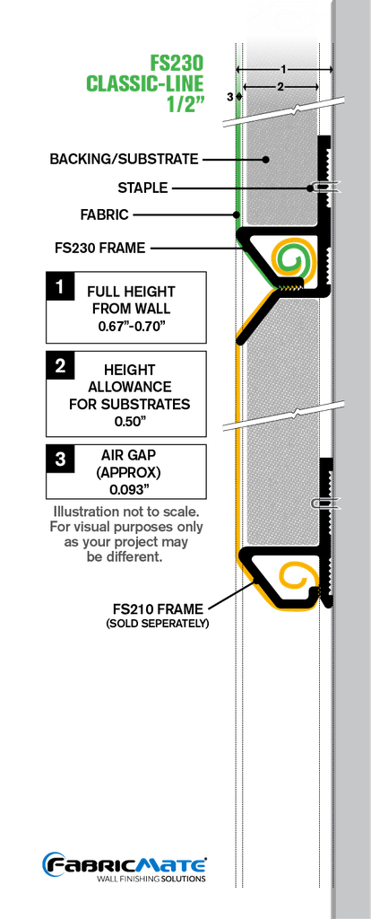 New & Improved FS230 Classic-Line 1/2″ (12mm) Beveled Intermediate Frame (actual height 16mm.) has been updated with an increased height to better accommodate 1/2″ substrates and allow for the proper air gap, as well as new Glue Grooves for better adhesion when using the adhesive and staple method.